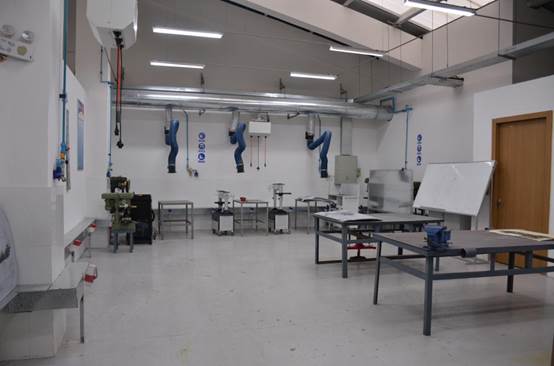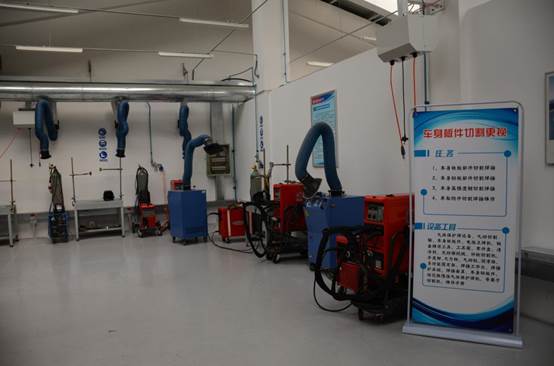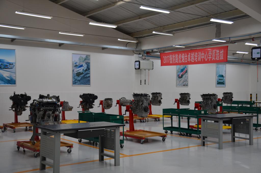 二楼实训场地共分为理论教学区,教学准备区。总成拆装区分为发动机拆装区和底盘部件拆装区,共分为10个工位,设备全部是由捷豹路虎中国免费提供,价值100余万元。焊接实训区场地和设备建设按照捷豹路虎中国的要求建设的同时,更加强调了作业标准化和系统化。