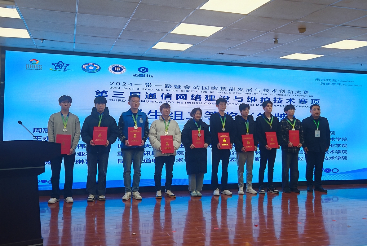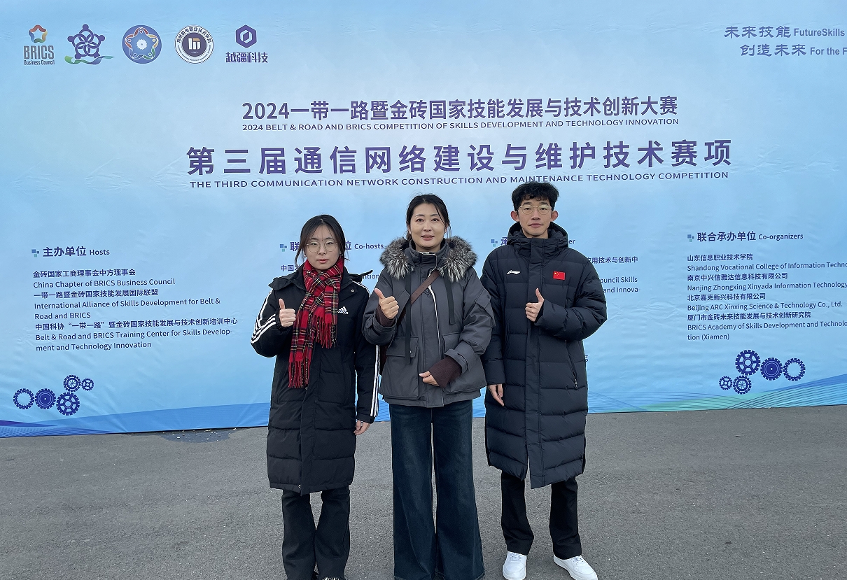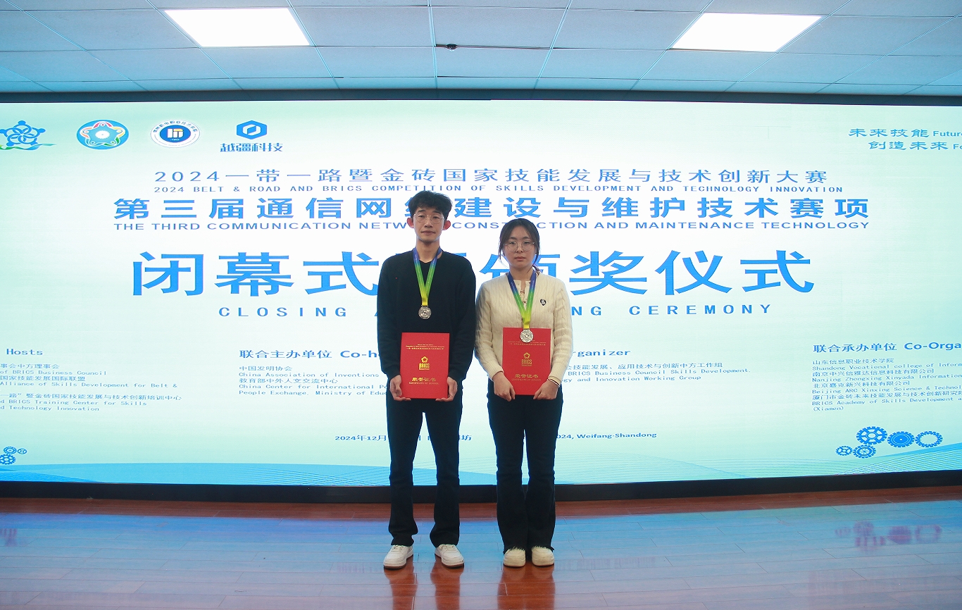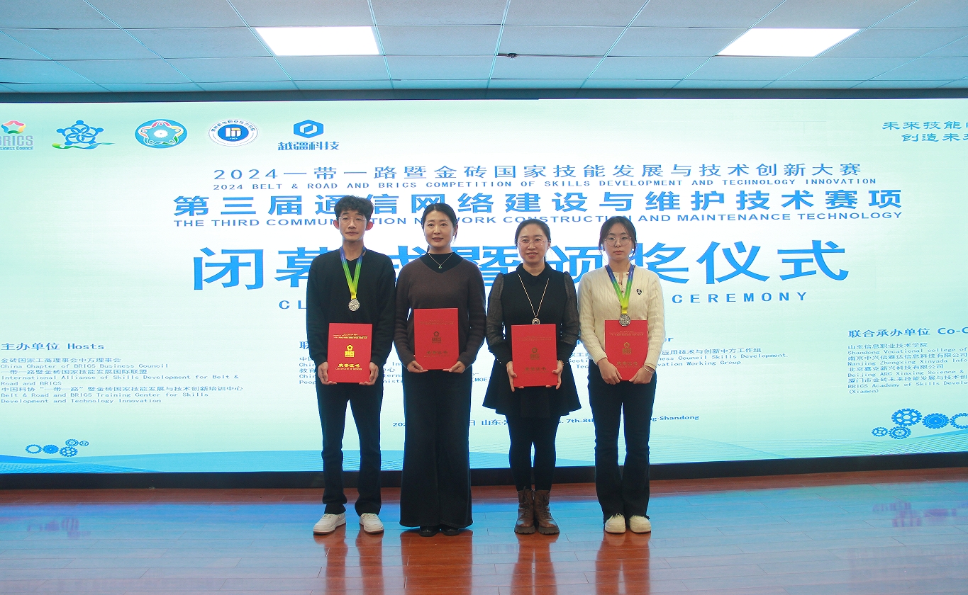 12月7日至12月8日,2024 一带一路暨金砖国家技能发展与技术创新大赛之通信网络建设与维护技术赛项全国总决赛在山东信息职业技术学院举办。来自全国20个省市、100余支队伍参赛,经过激烈角逐,Beat365中文官方网站电子工程系参赛选手张良康、国玉婷荣获全国二等奖,指导教师卞瑞姣和徐蕾获优秀指导教师奖,学院荣获优秀组织奖。
