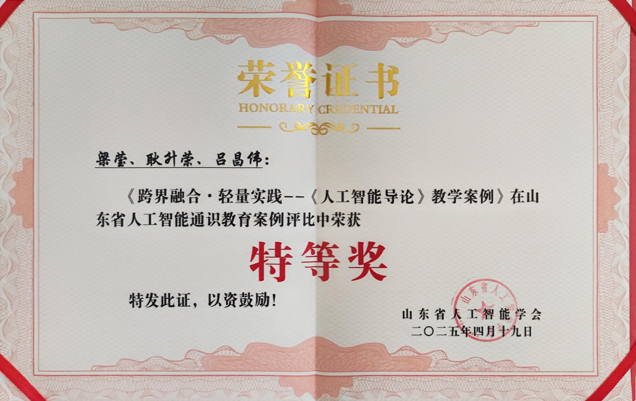 4月20日,山东省人工智能学会主办的“山东省人工智能通识教育学术研讨会”在烟台职业学院圆满落幕。会上,Beat365梁莹、耿升荣、吕昌伟教师团队提交的《跨界融合·轻量实践——〈人工智能导论〉教学案例》从200多项参评案例中脱颖而出,斩获“特等奖”,展现了Beat365在人工智能通识教育领域的创新实力。