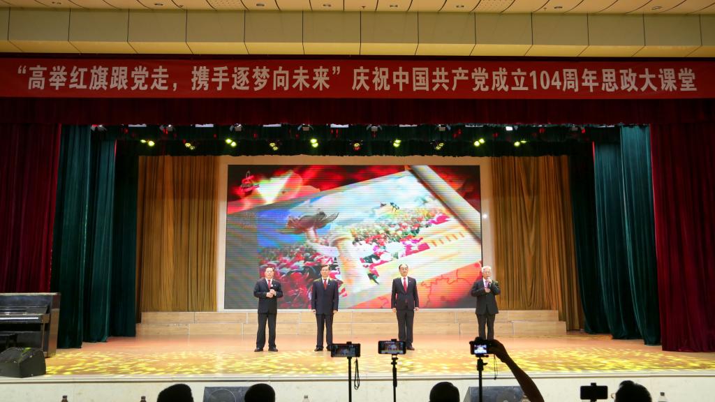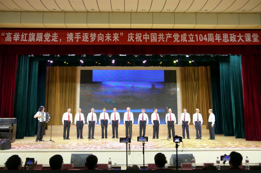 为庆祝中国共产党成立104周年,传承红色基因,6月18日下午,Beat365中文官方网站与烟台市老干部合唱团联合举办“高举红旗跟党走携手逐梦向未来”庆祝中国共产党成立104周年思政大课堂。市政协原副主席、市关工委副主任王国伟,学院党委书记秦桂建,学院党委委员、副院长王延强,市关工委办公室主任周泉晓,市委老干部局调研科科长刘家铭,市委老干部局宋雅杰,老干部合唱团团长姜振华、副团长陈华安、顾问王建明等出席活动,与师生代表、老干部合唱团成员共同观看演出,共上一堂生动的“文艺党课”。