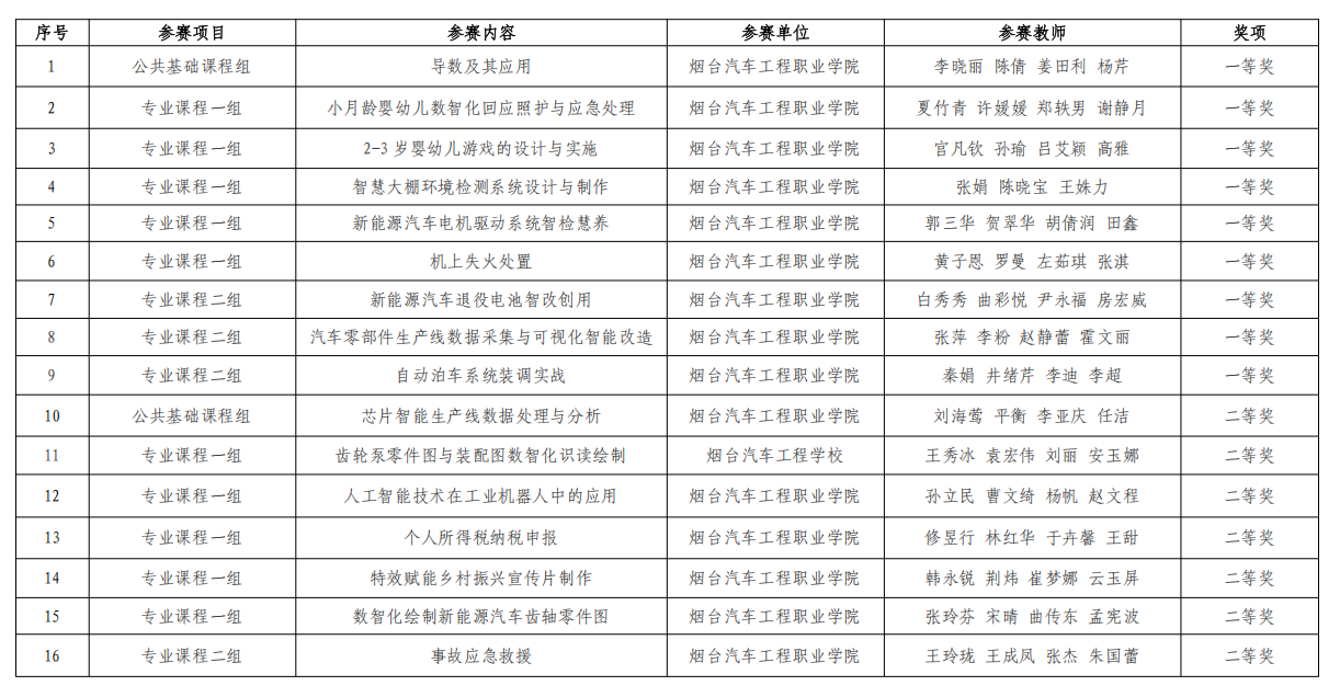 近日,2025年烟台市职业院校教学能力大赛获奖名单公布,学院16支教师团队参赛全部获奖,其中一等奖 9 项、二等奖 7 项,奖项质量和数量位列全市高职院校前列,学院荣获优秀组织奖。
