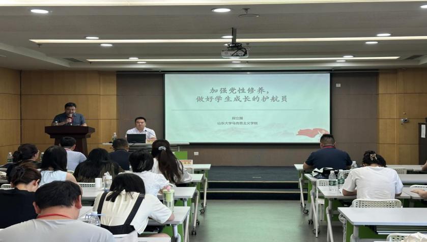 山东大学马克思主义学院马克思主义基本原理教研室副主任、硕士生导师段立国以《加强党性修养,做好学生成长的护航员》为题,阐明了“思政工作者先受教育,才能育人”的道理。