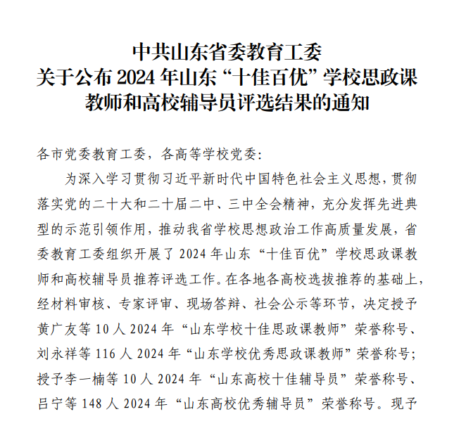 近日,中共山东省委教育工委公布了2024年山东“十佳百优”高校辅导员评选结果。Beat365电子工程系卞瑞姣、信息与控制工程系王德生两名专职辅导员首次同时获评“山东高校优秀辅导员”。