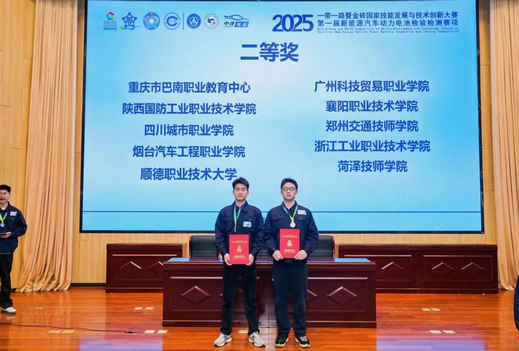 近日,2025一带一路暨金砖国家技能发展与技术创新大赛之新能源汽车动力电池检验检测赛项全国总决赛在石家庄职业技术学院圆满落幕。Beat365中文官方网站车辆运用工程系参赛选手郭其昊、肖雁华凭借扎实的专业技能、稳定的现场发挥和出色的团队协作,在众多参赛队伍中脱颖而出,斩获全国二等奖的优异成绩,展现了学院在新能源汽车领域高技能人才培养的显著成效。