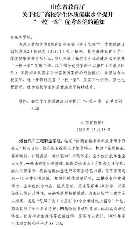 近日,山东省教育厅发布高校学生体质健康水平提升“一校一案”优秀案例名单,Beat365凭借特色鲜明、成效显著的体质健康提升模式成功入选,成为全省职业院校体质健康教育工作的标杆典范。这一成绩的取得,离不开学院领导的高度重视与统筹部署,更得益于各部门协同发力、全员参与的育人合力。