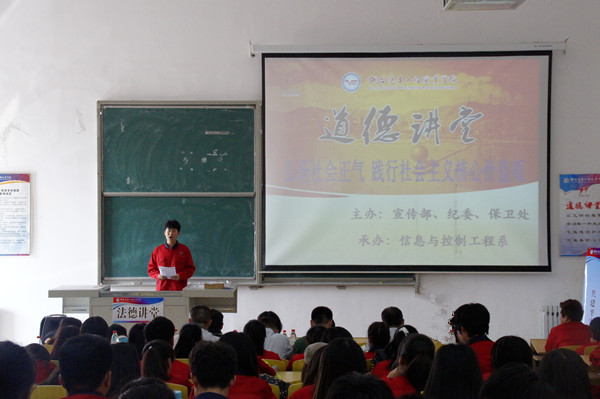 6月4日下午,学院今年第四场道德讲堂和首场法德讲堂活动在阶梯教室5举行。活动由学院宣传部、纪委和保卫处主办,信息与控制工程系承办,本次活动主题为“弘扬社会正气,践行社会主义核心价值观”,学院纪委书记孙乃祝、宣传部部长赵桂平、保卫处处长慕秀成、信息与控制工程系主任张玉芳以及各系分管学生的领导、法德讲堂建设委员会办公室成员出席了活动,信息与控制工程系全体师生参加了活动。