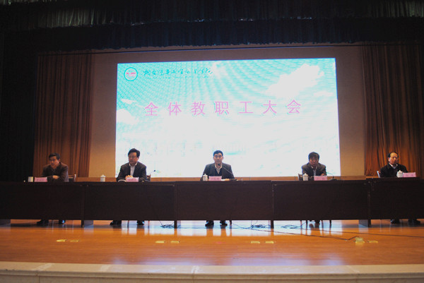 他在讲话中指出,目前学院的发展呈显出良好的发展态势:2013年学院被省教育厅确立为省级名校建设立项单位;省内招生人数逐年攀升;质量工程建设屡获佳绩。他转而指出,成绩固然可喜,问题尤需警醒,亟需我们加以克服和改进,主要表现在:顶层设计不完善;课堂教学未贯彻高职教育理念;学生工作仍然以管为主,引导少,疏通少;广大教职员工对于学院顶层设计等核心工作关心不够等等,这些都将成为学院下一步工作的重心和努力方向。