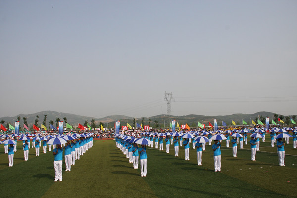 运动员退场后,伴随着节奏鲜明的旋律,开始了团体操表演。本届运动会开幕式团体操共分六个乐章:第一乐章——鼓舞中华,腰鼓舞气势恢宏,热烈奔放,展现了当代大学生的蓬勃朝气;第二乐章——和谐之美,配合默契,动作协调,场面大气又不失特色,体现了传统文化“和而不同”的理念;第三乐章——舞动青春,澎湃着青年学子热烈勃发的激情,传递着年轻一代崇尚健康的追求;第四乐章——蓝色梦想,舞动出运动健儿激扬的梦想,旋转的花伞蕴藏着超越梦想的坚定信念;第五乐章——活力未来,活力四射,寓意以青春的活力开启美好的未来;第六乐章——寻梦远航,像起伏的海浪波涛澎湃,场面宏大整齐,寓意学院将在蓝色经济的大潮中扬帆远航。六个乐章集中展现了本届运动会“自信、跨越、梦想”的主题,以此勉励全院学子为了梦想,满怀信心和勇气去实现人生的每次跨越。