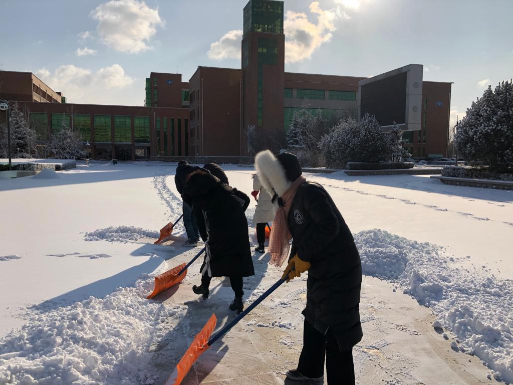 一场寒冷的大雪融化在电子工程系教师铲冰扫雪的热情之中,学院的各条主干道又恢复了畅通、洁净,雪日里的校园也因电子工程系教师的这份责任担当而更加温馨、美丽。