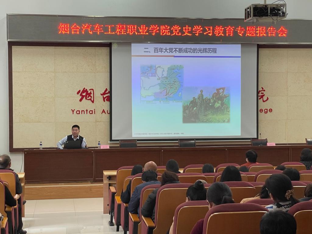 11月25日下午,机电工程系党总支邀请市委党校陈海涛教授作《中国共产党的奋斗历程与初心使命》专题讲座。机电工程系副主任谢丽君主持会议,学院党委书记李翠玲、机电工程系党总支全体党员及其他各党总支党员代表参加学习。