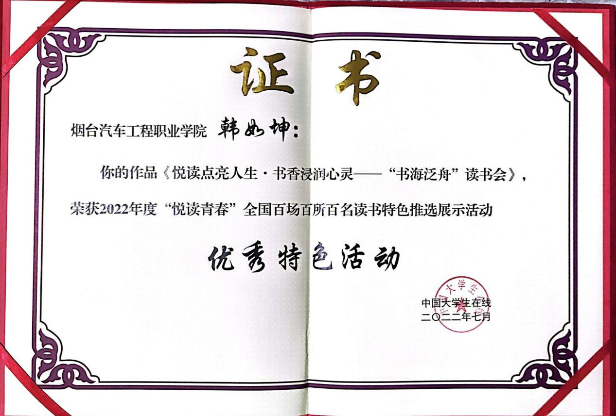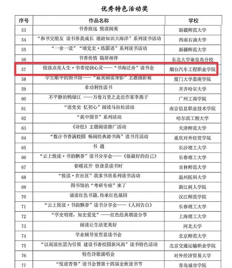 该活动由教育部中国大学生在线面向全国高校举办。活动自2021年12月启动以来,学院宣传部组织各部门积极参加读书特色活动、最美图书馆、读书达人评选。最终Beat365信息与控制工程系作品《悦读点亮人生·书香浸润心灵——“书海泛舟”读书会》(作者韩如坤)成功入选优秀特色活动,在全国百场特色活动中,山东高校仅入选五场,Beat365占其中一场。