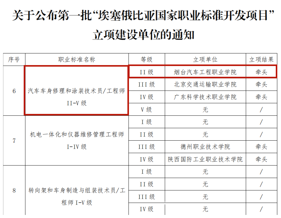 近日,中非职业教育联盟发布了《关于公布第一批“埃塞俄比亚国家职业标准开发项目”立项建设单位的通知》,由学院车辆运用工程系组织申报的汽车车身修理和涂装技术员II级职业技能岗位标准开发项目成功获得立项,并以牵头单位开展后续的项目实施工作。该项目经学校申报、专家评审和在线答辩等多个环节激烈竞争,最终脱颖而出得以成功立项。