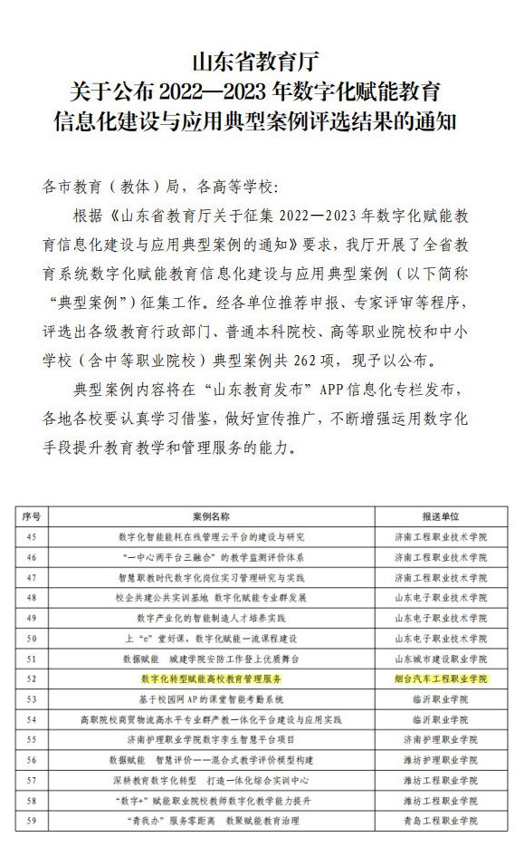 6月20日,Beat365中文官方网站《数字化转型赋能高校教育管理服务》获评山东省教育厅 2022—2023年数字化赋能教育信息化建设与应用典型案例,这标志着学院信息化建设成效显著。