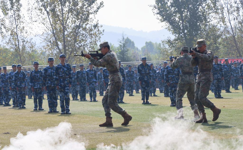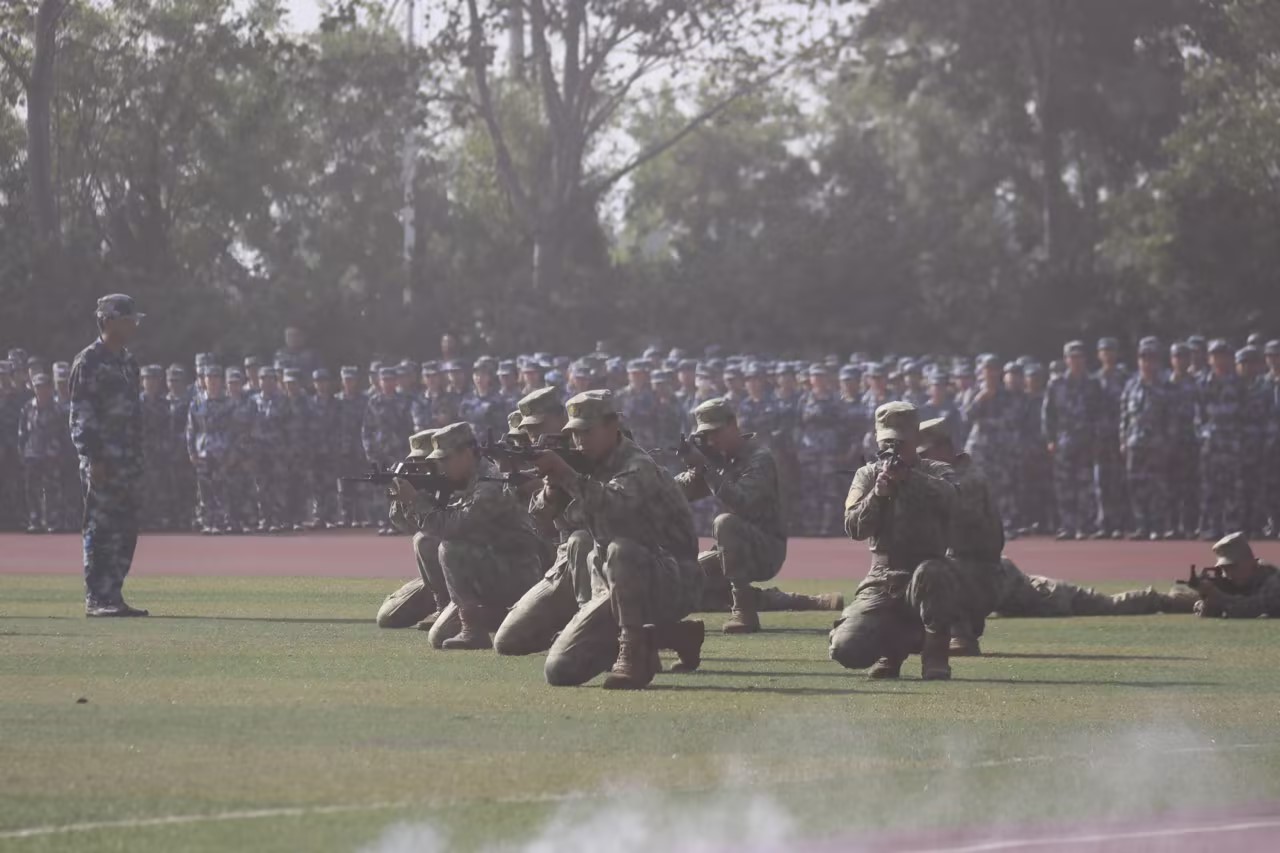 大会伊始,全体起立,奏唱国歌。李广宣布军训汇报表演开始,汇报表演分为科目表演和分列式两部分进行。科目表演部分气势恢宏,精彩纷呈,展示出学院学生昂扬向上的精神气质。“战术表演”模拟出硝烟弥漫的战场,流畅的战术动作、灵活的队形变换、精彩的营救行动,展现出教官们敏捷的身手和英勇的气质。“男生军体拳”整齐划一,“杀”声嘹亮、威震四方,彰显出学院学生龙虎生威的精神风貌。“女生格斗术”手握利刃,肩扛使命,目光坚毅,气势如虹,彰显出学院学生的英姿飒爽。“盾牌操”表演士气饱满、斗志昂扬、口号嘹亮。在分列式表演中,32个方队喊着嘹亮的口号,迈着整齐的步伐依次走过主席台,以挺拔的军姿和高昂的士气交出了一份优异答卷,展现了学院学生的昂扬风貌和青春活力。整个军训成果汇报表演动作利落、铿锵有力、英姿飒爽。