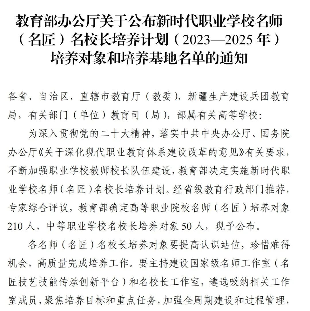 “新时代职业学校名师(名匠)名校长培养计划”是教育部为充分发挥名师(名匠)名校长辐射带动和“智库”作用,助力成长为职业教育教师、校长创新发展的引领者、探索者,带动职业教育教师校长能力素质整体提升启动的专项培养项目。计划从2023年开始实施,每年遴选一批,进行为期三年的集中培养。旨在培养打造一批理想信念坚定、师德高尚、教育教学能力和专业实践能力突出的双师型名师(名匠),一批办学理念先进、办学定位准确、勇于开拓创新、精通现代职业学校治理的教育家型名校长。此次遴选,山东省共有9人入选名师(名匠)培养对象名单,3人入选名校长培养对象。