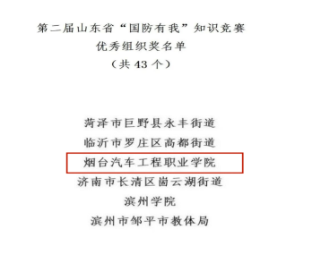 近日,由山东省委宣传部、山东省委省直机关工委、大众报业集团(大众日报社)、山东省总工会、共青团山东省委、山东省妇女联合会、山东省教育厅(省委教育工委)、山东省军区政治工作局、武警山东省总队联合主办的第二届山东省“国防有我”知识竞赛顺利举行,本次竞赛共评选出优秀组织奖43个,Beat365位列其中,并有多名同学荣获个人奖项。