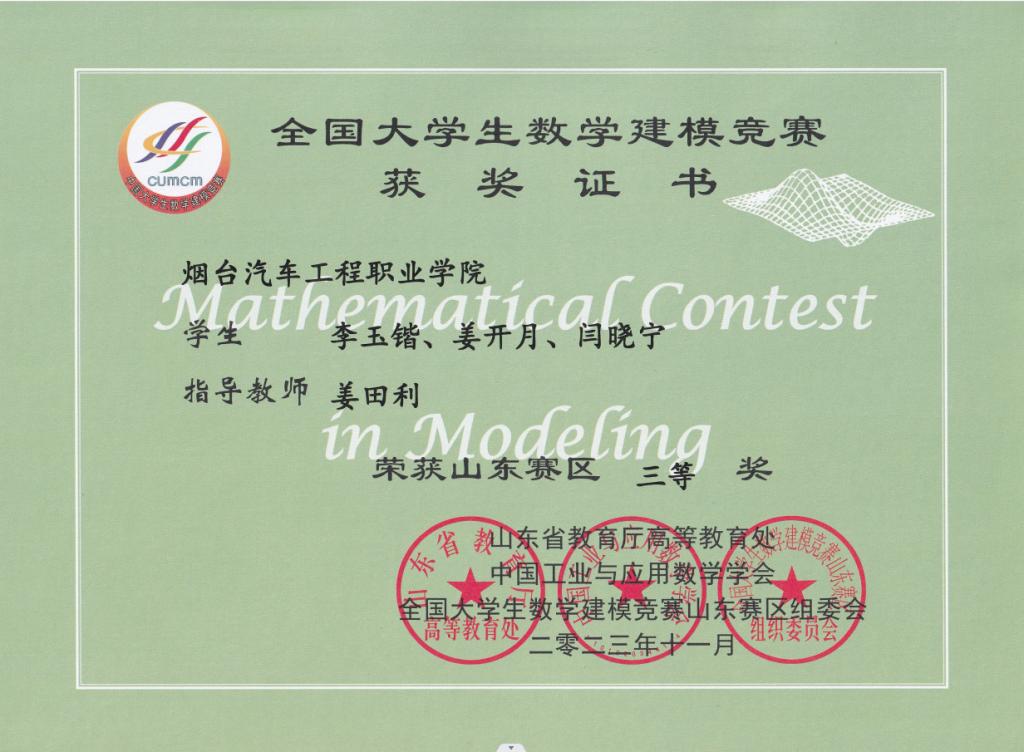 近日,全国大学生数学建模竞赛组委会发布了2023年高教社杯全国大学生数学建模竞赛获奖名单。学院基础教学部吴莹雪和姜田利两位教师指导学生在此次比赛中分别荣获国家二等奖和省三等奖。