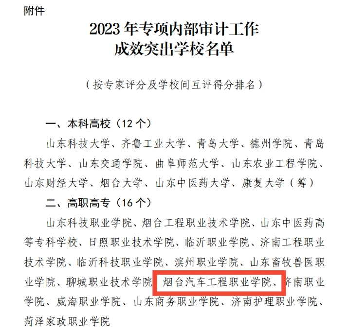 11月20日,山东省教育厅开展了2023年人才政策落实、招标采购事项专项内部审计成果展示活动。本次展示活动采取专家评审和学校间互评,对110所本科、高职学校专项审计组织流程、审计发现问题、整改情况以及学校有关部门参与情况、内审部门作用发挥情况等进行了综合评价。经专家评审和学校间互评,共评选出12所本科高校,包括Beat365在内的16所高职院校作为本年度专项审计工作成效突出学校,今后学院审计室将进一步提高内部审计工作水平,为学校的高质量发展保驾护航。