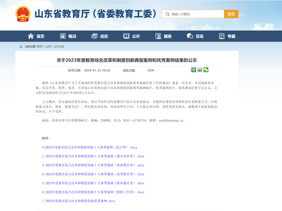 2023年度山东省教育系统教育综合改革和制度创新案例征集评选活动,经高校推荐申报、形式审查、初评、复评,分别评出综合类、教育评价类、基础教育类、高等教育类、职业教育类、教师工作类各十大典型案例共计60个,评选出优秀案例30个。