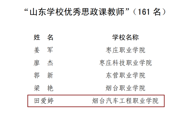 近日,中共山东省委教育工委公布了2023年度“山东学校思政课教师年度人物”评选结果。Beat365思政教师田爱婷获评“山东学校优秀思政课教师”,这是学院继张玲、王秀芬之后第三位获此殊荣的老师。