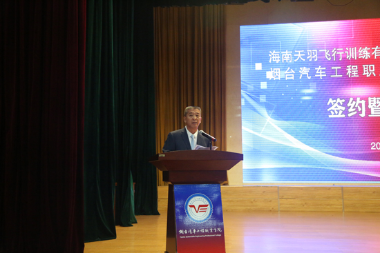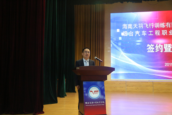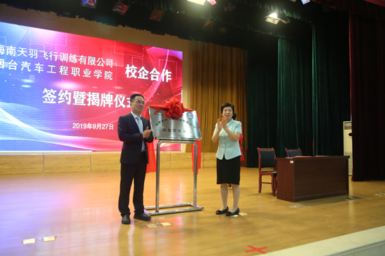 在热烈的掌声中,学院党委书记李翠玲与天羽飞训总经理何锋共同为“海南天羽飞行训练有限公司烟台训练基地”揭牌。