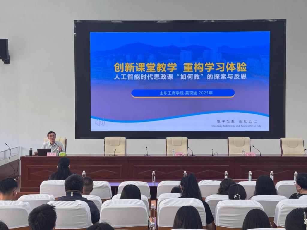 开班仪式后,培训进入精彩的专家授课环节。山东工商学院马克思主义学院吴现波副教授作了题为《创新课堂教学重构学习体验》的首场专题讲座,从教学艺术与AI技术相结合的角度深入探讨了人工智能时代思政课“如何教”的探索与反思。下午,青岛理工大学马克思主义学院史倩教授以《从“备赛”到“出彩”,如何让课堂“达标”又“亮眼”》为题,结合自身的参赛经验以及教学实践与反思,系统解析了比赛规则、规则变化的背景、备赛方法以及如何将教学竞赛的高标准与新理念转化为日常课堂教学的实效。