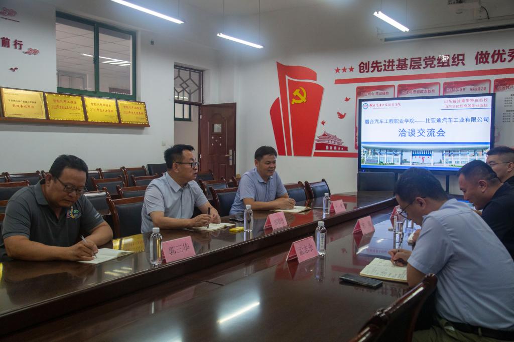 为精准对接新能源汽车产业高质量发展需求,深化校企协同育人机制,进一步拓宽学生实习与就业渠道,9月8日,比亚迪汽车工业有限公司(济南)人力资源部宋瑞经理、第十五事业部孟志永经理、人力资源部张富顺主管等一行来学院洽谈合作事宜。智能汽车工程系主任邹德伟、副主任王化、教学科负责人郭三华等出席会议。与会双方就专业建设、人才培养、产教融合落地等核心议题展开深入交流。