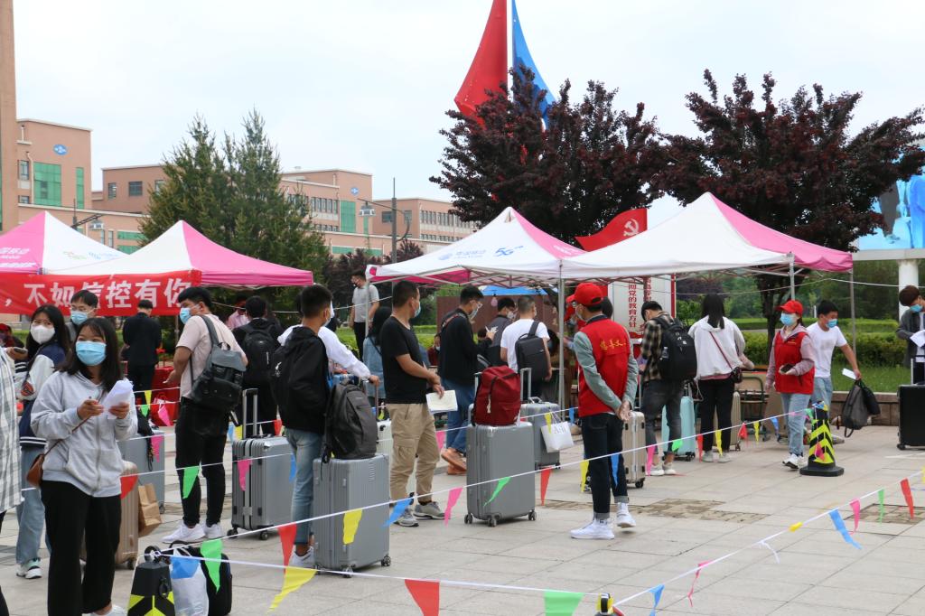 腋下体温检测、行李杀毒、红外体温测试、人脸识别、“两卡一码”检查、安全承诺书上交……一系列流程有条不紊地推进着,不论是老师还是志愿者都在忙碌而又热情的服务着,他们暖心的话语、热情的服务、真诚的微笑感染着返校的每一位学生。信控系19级计算机网络技术8班的曲宁同学动情地说:“从车站开始,老师们亲自迎接我,还为我搬运行李,让我们这些同学特别感动,找到了家的感觉。在我的大学生活中,这是一段特殊而又难忘的记忆,谢谢各位老师,谢谢学院。”