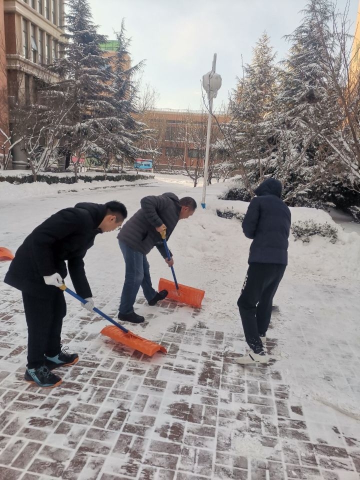 在系领导、值班老师的带领下,同学们穿好棉服、戴好手套,拿着铁锹、扫帚等工具来到分配好的区域,开始扫雪除冰工作。扫雪现场,师生齐心协力,配合默契,干劲十足,劳动的笑声和铲雪的声音此起彼伏。虽然室外温度很低,但大家劳动的热情和团结的力量让这个冬日变得格外温暖。在师生的共同努力下,冰雪交融的路面逐渐露出它们本来的面貌,为师生安全出行开辟了一条洋溢着暖暖温情的方便之路。