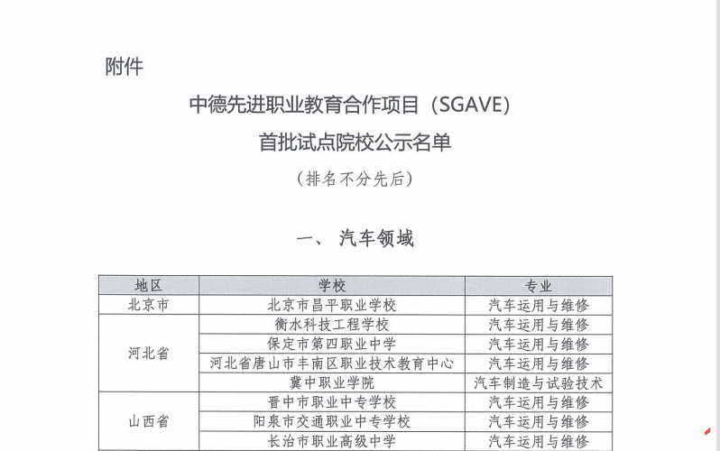 2021年8月教育部办公厅下发关于开展中德先进职业教育合作项目遴选工作的通知,Beat365汽车检测与维修技术专业参加该项目遴选工作,经过院校申报、省级推荐和部级项目组实地考察,最终在464所院校申报的583个专业中脱颖而出,获评中德先进职业教育合作项目(SGAVE)汽车领域首批试点院校。