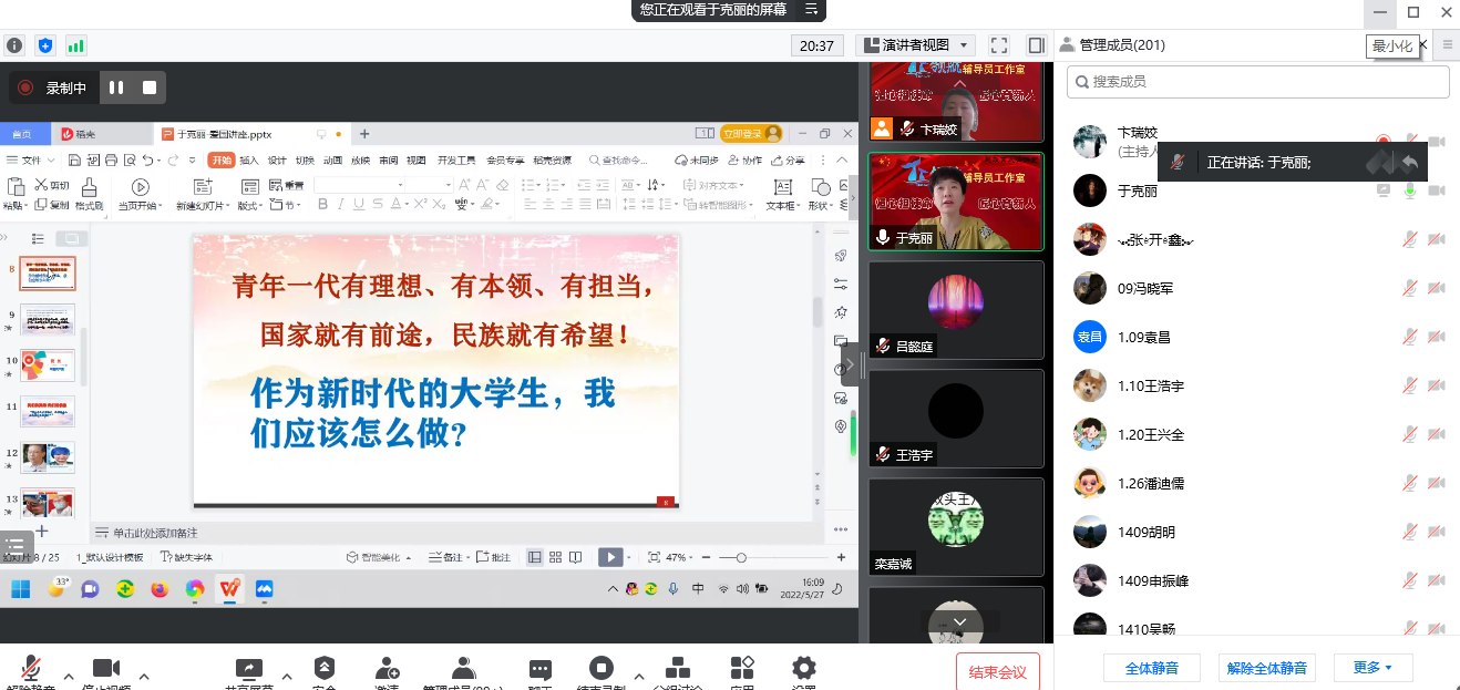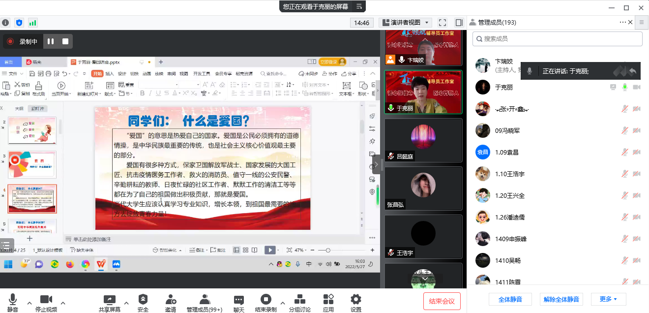 5月27日下午4点,电子工程系“领航”辅导员工作室思政育人讲堂在线开讲。电子工程系学生科科长于克丽做了《锤炼政治思想 弘扬爱国情操》的主题讲座,从新时代大学生如何爱国、爱党及爱校三个方面进行了深入解读,系部300余名学生相聚云端,共同倾听。