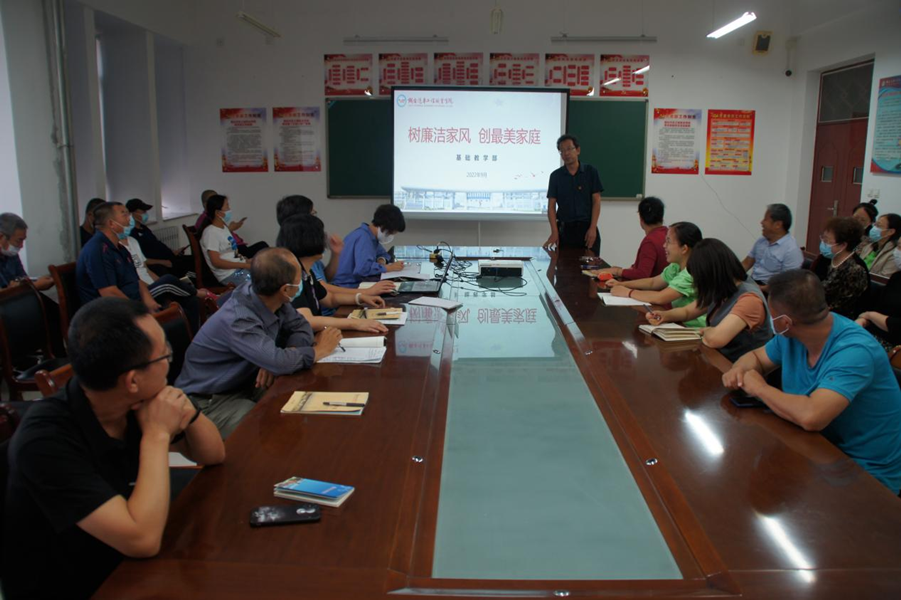 9月14日下午,基础教学部以“讴歌新时代 喜迎二十大”为主题,结合学院党委《关于开展“树廉洁家风 创最美家庭”主题系列活动的方案》要求,举办了一场《倡美好家风 讲身边故事》分享会,两名老党员赖剑峰、刘宗俊结合各自的生活经历讲述了各自对“孝德”和“仁德”的体悟。分享会由基础教学部党支部书记赵桂平主持。