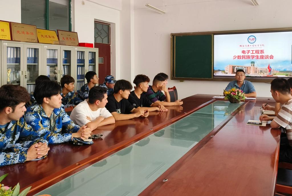 为深入学习贯彻习近平总书记关于加强和改进民族工作的重要思想,铸牢中华民族共同体意识,进一步关心关爱少数民族学生,电子工程系于9月18日在会议室召开少数民族学生座谈会,2023级辅导员及少数民族学生代表参加座谈会。座谈会由系负责人陈晓宝主持。
