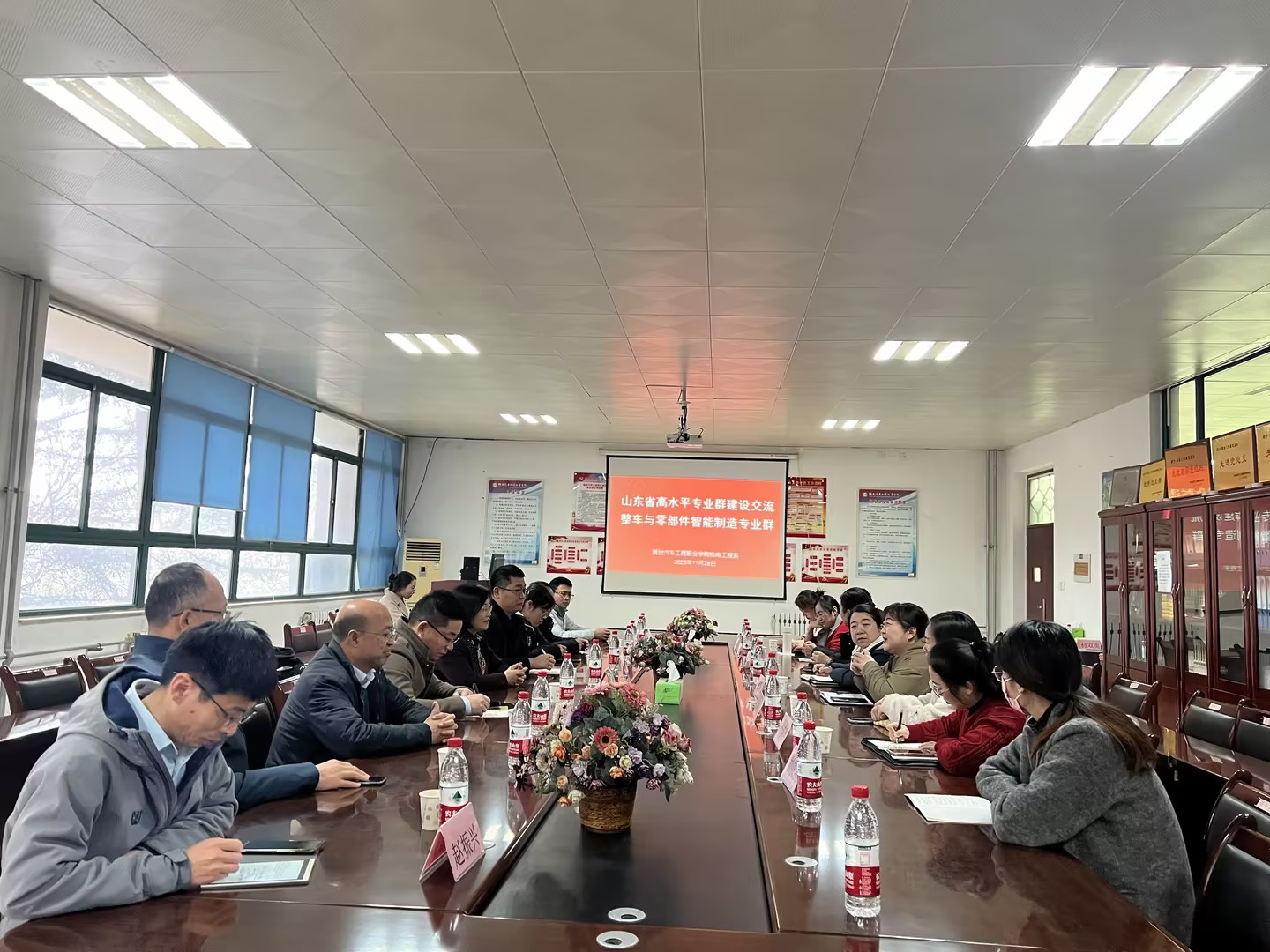 寒冬初上,瑞雪迎宾,11月28日上午潍坊职业学院汽车工程学院院长杜洪香、潍坊职业学院机电工程学院实训中心主任李海庆等一行9人到机电工程系调研交流,机电工程系谢丽君主任在会议室热情接待了来客,教学科刘凤景副科长、教研室主任、专业负责人以及部分骨干教师参加了座谈会。谢丽君主任向杜洪香院长一行介绍了学院整体概况以及机电工程系在专业设置、师资队伍建设、质量工程建设等方面的情况;机电工程系以赛促教、赛教结合,既提升了教师自身的综合素质,又激发了教师队伍的上进心、增强了凝聚力。杜洪香院长介绍了潍坊职业学院在高水平专业群建设、实训教学、学生大赛等情况,重点介绍了其在职业技能大赛、“双创类”大赛中的经验。双方还对课程建设、产教融合、校企合作等开展情况进行了沟通,为后续深入合作奠定了良好基础。