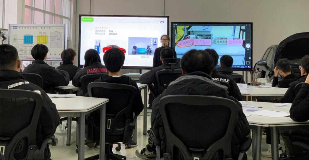 田鑫老师以“驱动系统认知”为题,从“纯电动汽车为什么动起来”引入,系统讲解驱动系统部件的组成及驱动系统原理,通过传统燃油车与纯电动汽车驱动系统对比,突出纯电动汽车的起步加速、效率以及节能减排方面优势,层层递进启发学生树牢安全意识、环保意识和节能减排意识。课上采用小组讨论、张贴板法等教学方法,有效激发学生们的参与度和学习热情。