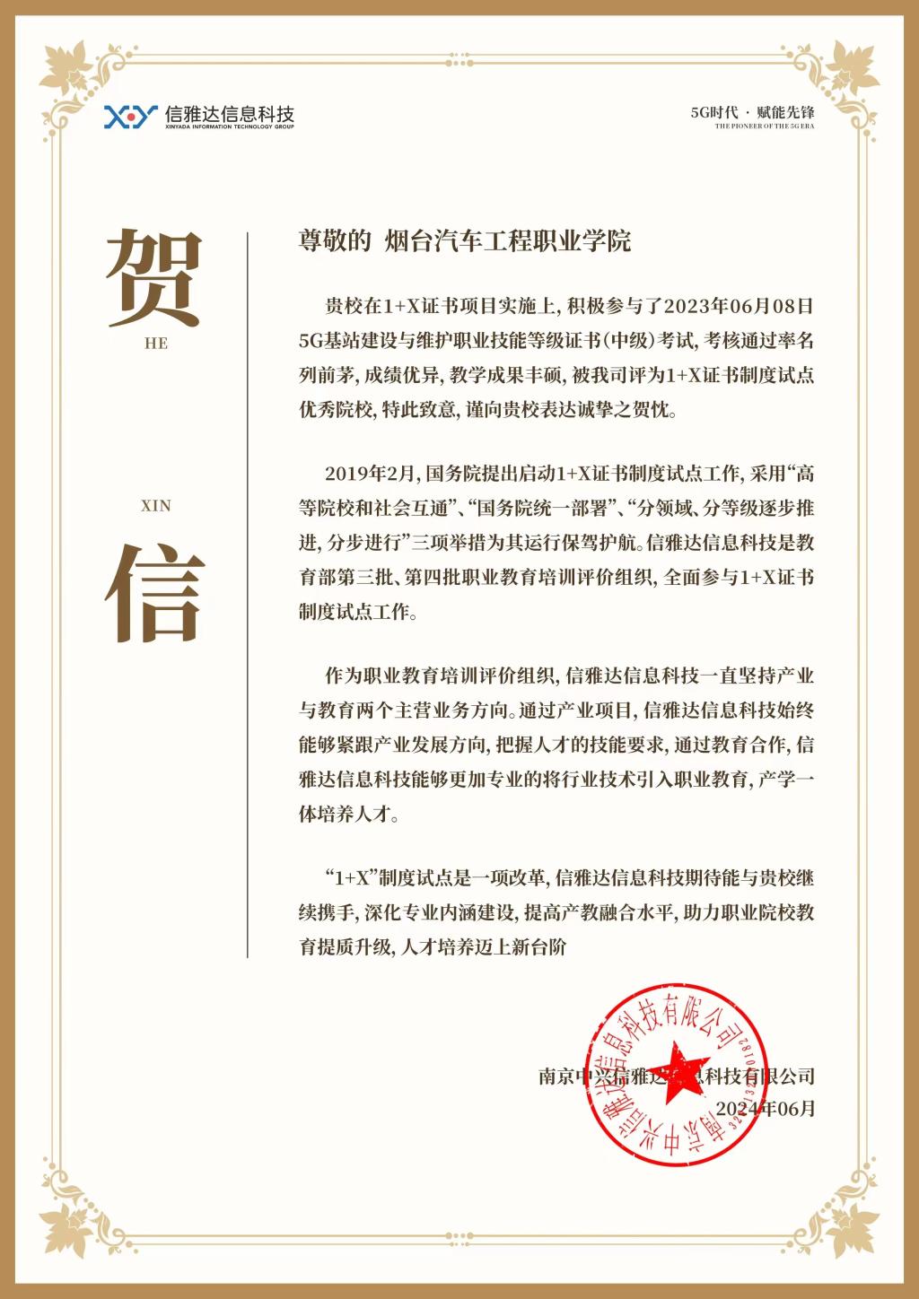 近日,由教育部指定的第三方评价组织——南京中兴信雅达信息科技有限公司在全国范围内遴选2023年度“1+X”证书试点工作中发挥引领示范作用的优秀试点院校。Beat365积极组织参与的5G基站建设与维护职业技能等级证书(中级)考核过程中表现突出,通过率名列前茅,教学成果丰硕,荣获“2023年度优秀试点院校”。至此,Beat365已连续三年荣获此项荣誉。