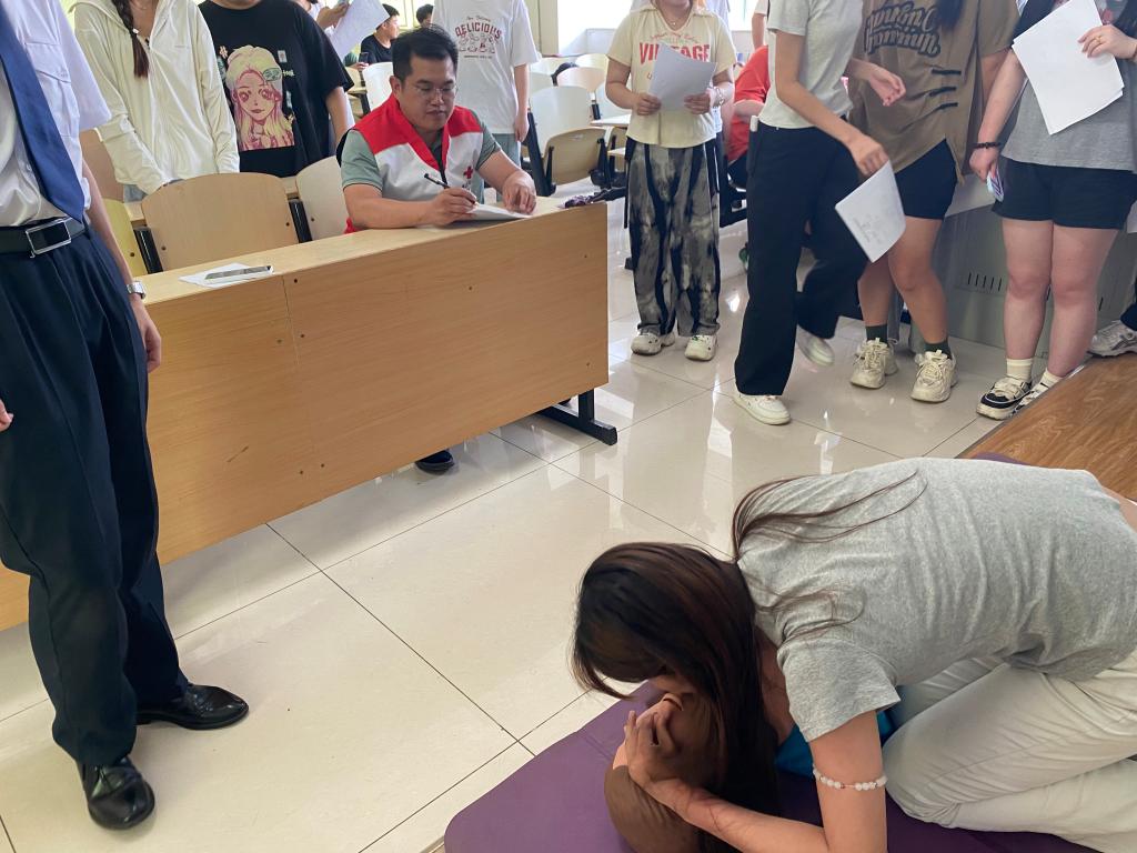 此次培训通过线下方式开展,在培训现场,学生们认真听讲、积极互动,并在红十字救护老师的指导下进行了实际操作演练并进行考试。心肺复苏和止血包扎是实践训练的重中之重,学员们需要观察环境、判断意识和呼吸、翻转体位、呼救求援、胸外按压、AED除颤、打开气道、人工呼吸等,每个环节都是实现高质量心肺复苏的关键一步。创伤是生活中常见的伤害。快速、准确的包扎外伤是救护的重要一环。它可以起到快速止血、保护伤口、防止进一步污染、减轻疼痛的作用,有利于转运和进一步的治疗。此次培训旨在提高学生们的应急救护意识和能力,让更多的同学掌握基本的急救知识和技能,从而提高自己的自身能力。