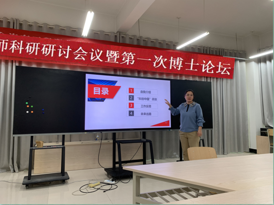 教务处科研科解淑英就博士教师们比较关心的教科研项目的研究类别、选题方向、申报流程、注意事项等做了详细阐述,鼓励博士厚积薄发,结合岗位工作,找准自己的发展方向,通过博士论坛交流不同学科的发展前沿,激发灵感,开展跨领域研究,强强联合,争取高层次基金项目。