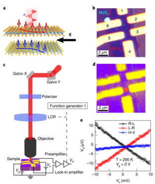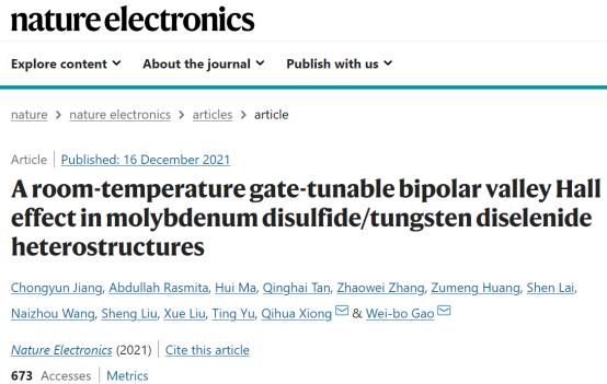 近日,我校beat365亚洲官方网站青年教师马惠在《自然·电子学》(《Nature Electronics》)上发表了题为《A room-temperature gate-tunable bipolar valley Hall effect in molybdenum disulfide/tungsten diselenide heterostructures》的研究成果。马惠为该论文的共同第一作者,新加坡南洋理工大学高炜博教授和清华大学物理系熊启华教授为通讯作者。该项成果为马惠2018年在新加坡南洋理工大学做访问学者期间与合作者共同开展,并于访学回国后持续合作完成的。《Nature Electronics》是有重要影响的国际学术期刊,影响因子长期保持在30以上。