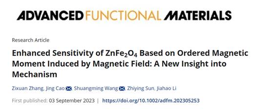 beat365亚洲官方网站曹静课题组近期在《Advanced Functional Materials》发表题目为Enhanced Sensitivity of ZnFe2O4 Based on Ordered Magnetic Moment Induced by Magnetic Field: A New Insight into Mechanism的研究成果。该工作的第一作者为硕士研究生张子瑄,曹静和王双明为该论文的通讯作者。