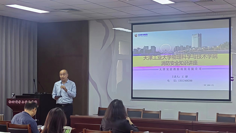天津安居消防科技有限公司防火培训部特级讲师王健对近年楼宇内发生的火灾典型案例进行了深刻剖析,对宿舍、楼宇、电动车、实验室的安全隐患进行了重点讲解,分析了火灾导致伤亡的主要原因,讲授了初期小火的扑灭方法、大火的逃生方法,重点阐释了人防、物防、技防的防火体系。