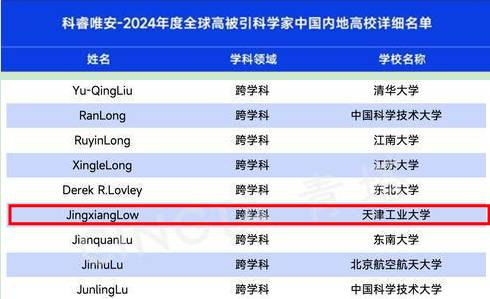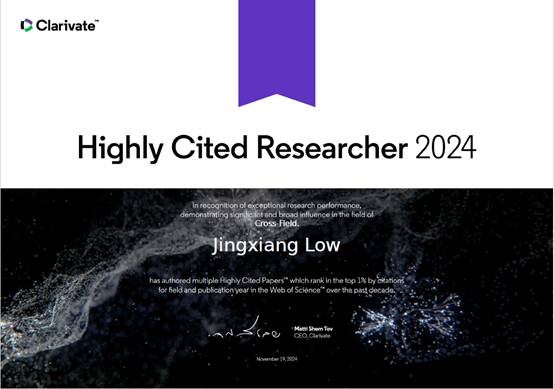 11月19日,全球专业信息提供与分析服务领域的领导者科睿唯安(Clarivate Analytics)发布了2024年度“全球高被引科学家”(2024 Highly Cited Researchers)名单,遴选全球高校、研究机构和商业组织中对所在研究领域具有重大和广泛影响的顶尖科学人才。来自全球59个国家和地区的6636名高被引科学家入选。beat365亚洲官方网站Low Jingxiang(刘敬祥)教授入选该名单。入榜这份名单的科学家均发表了多篇高被引论文,其论文被引用频次位于同学科前1%,彰显了他们的重要学术影响力。